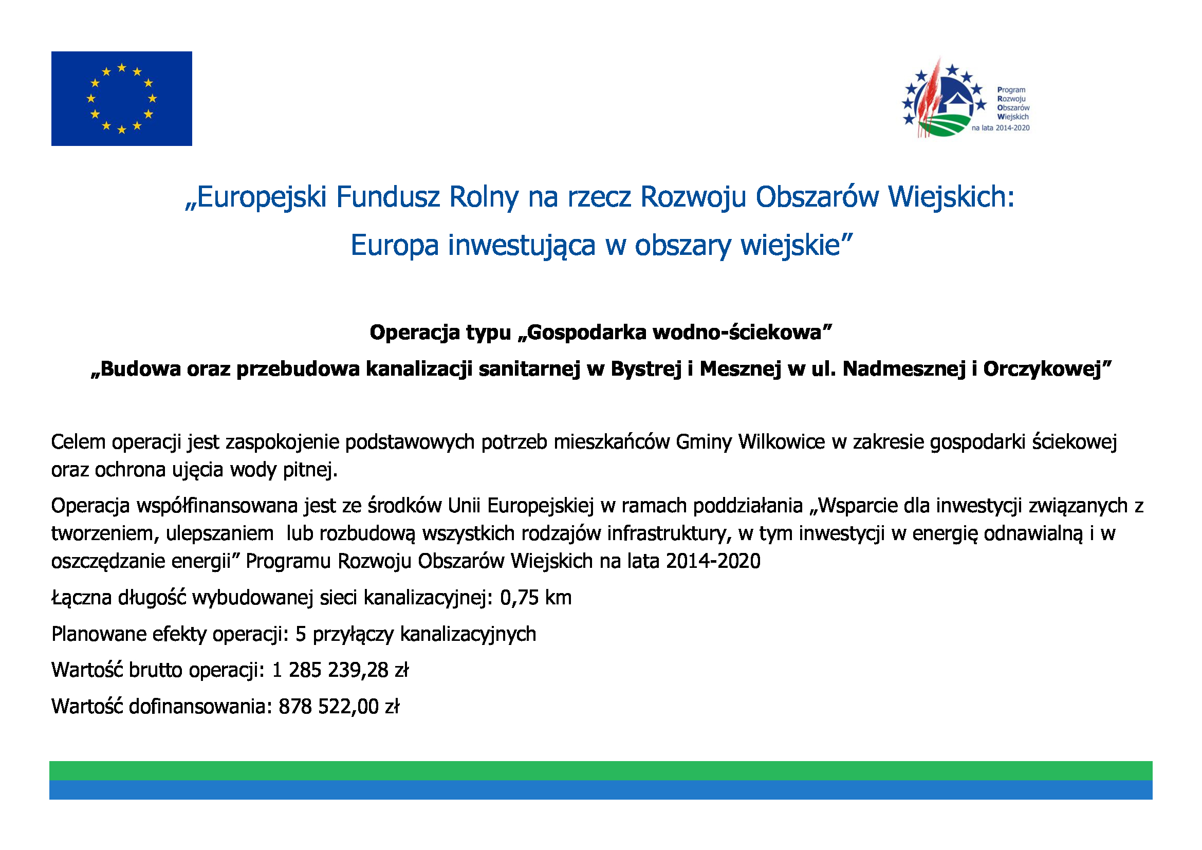 Celem operacji jest zaspokojenie podstawowych potrzeb mieszkańców Gminy Wilkowice w zakresie gospodarki ściekowej oraz ochrona ujęcia wody pitnej. Operacja współfinansowana jest ze środków Unii Europejskiej w ramach poddziałania „Wsparcie dla inwestycji związanych z tworzeniem, ulepszaniem lub rozbudową wszystkich rodzajów infrastruktury, w tym inwestycji w energię odnawialną i w oszczędzanie energii” Programu Rozwoju Obszarów Wiejskich na lata 2014–2020.