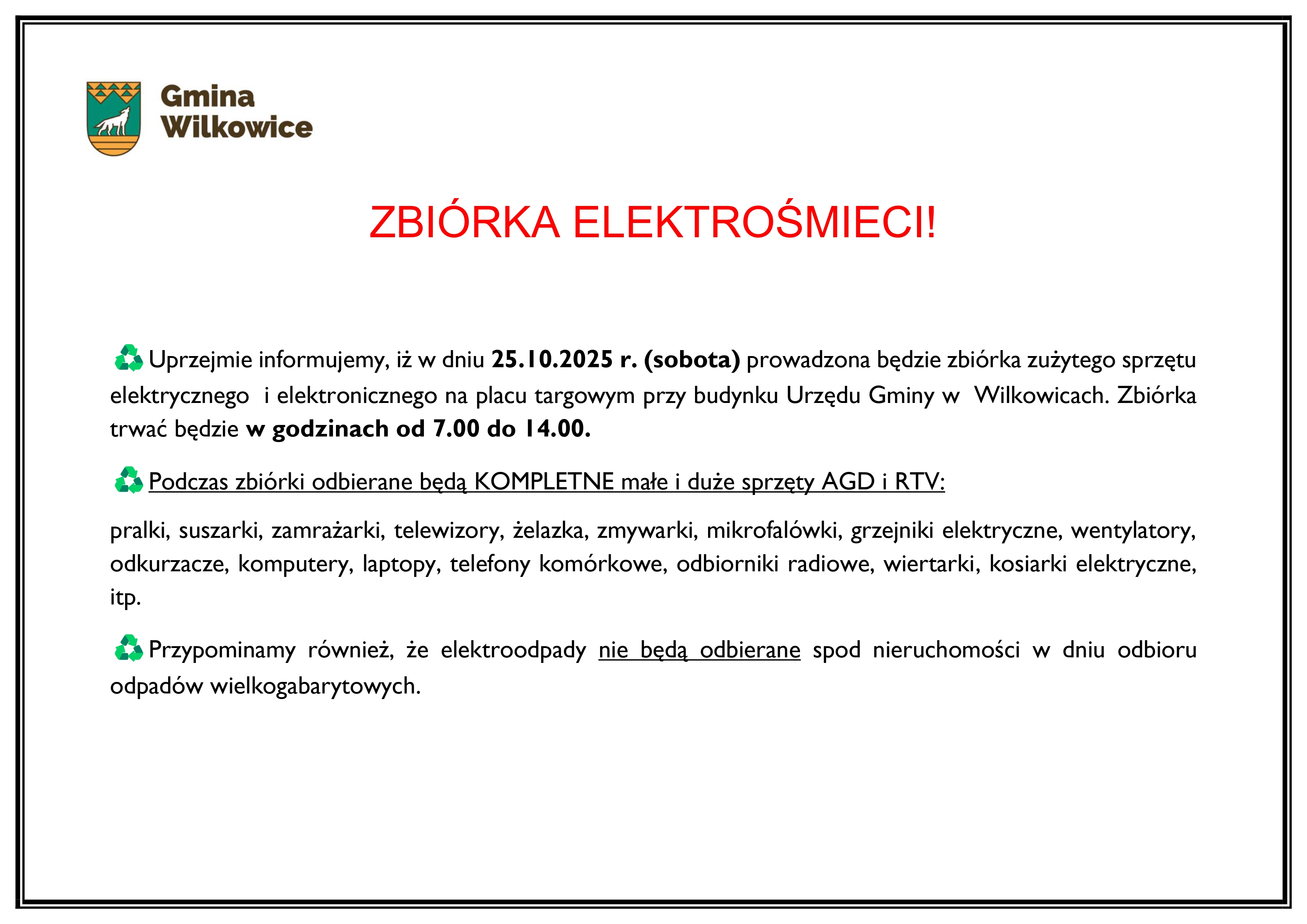 Uprzejmie informujemy, że w sobotę, 25 października 2025 r., na placu targowym przy budynku Urzędu Gminy w Wilkowicach, odbędzie się zbiórka zużytego sprzętu elektrycznego i elektronicznego.