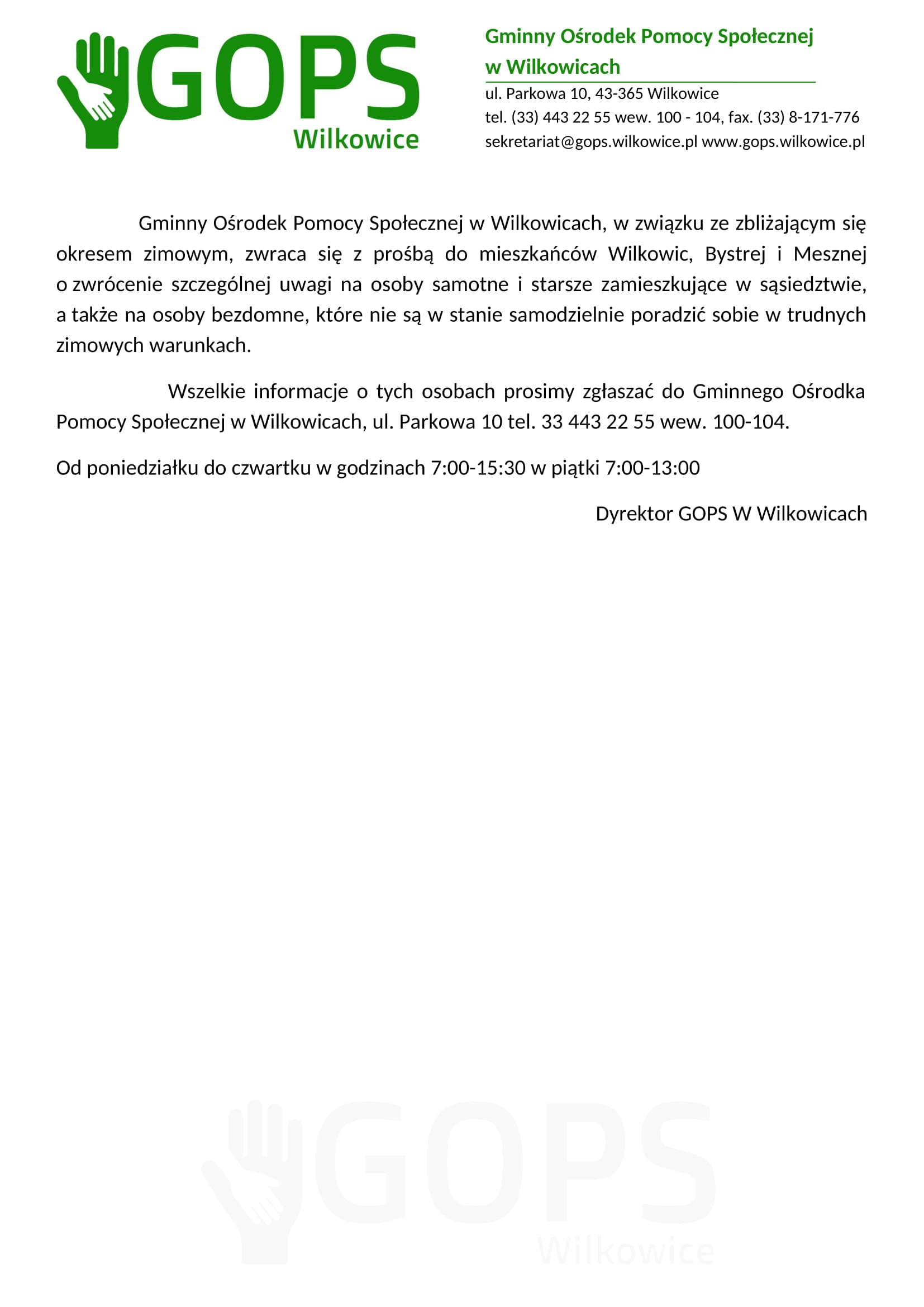 Gminny Ośrodek Pomocy Społecznej w Wilkowicach, w związku ze zbliżającym się okresem zimowym, zwraca się z prośbą do mieszkańców Wilkowic, Bystrej i Mesznej o zwrócenie szczególnej uwagi na osoby samotne i starsze zamieszkujące w sąsiedztwie, a także na osoby bezdomne, które nie są w stanie samodzielnie poradzić sobie w trudnych zimowych warunkach.