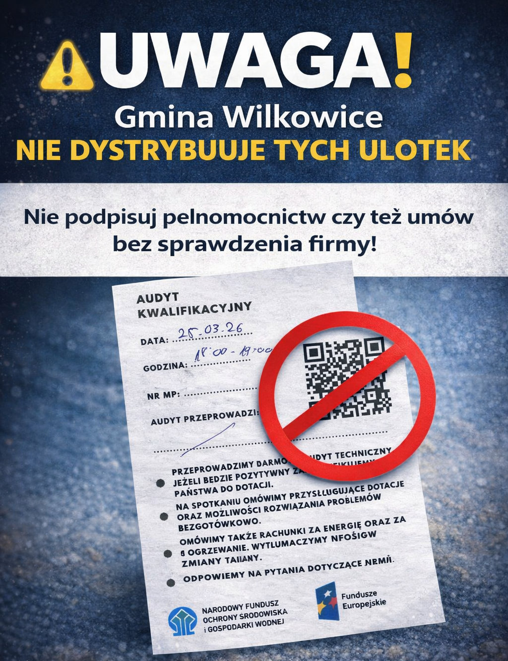 w związku z sygnałami dotyczącymi ulotek AUDYT KWALIFIKACYJNY, pozostawianych w skrzynkach Państwa domów, informujemy, że pracownicy gminy nie roznoszą ulotek oraz nie umawiają się na spotkania w domach, w celu omówienie dotacji z NFOŚiGW.