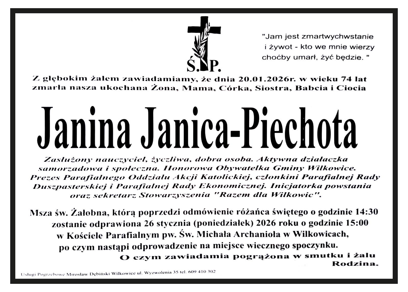 Śp. Janina Janica-Piechota była postacią niezwykle zasłużoną dla, tak bliskich Jej sercu, Wilkowic. W ramach swojego zaangażowania na rzecz lokalnej społeczności pełniła, między innymi, funkcje Prezesa Parafialnego Oddziału Akcji Katolickiej w Wilkowicach, członka Parafialnej Rady Duszpasterskiej, a także Parafialnej Rady Ekonomicznej. Była również inicjatorką powstania oraz sekretarzem Stowarzyszenia „Razem dla Wilkowic". Organizatorką niezliczonych inicjatyw na rzecz rozwoju miejscowości oraz pielęgnacji jej kultury i historii.