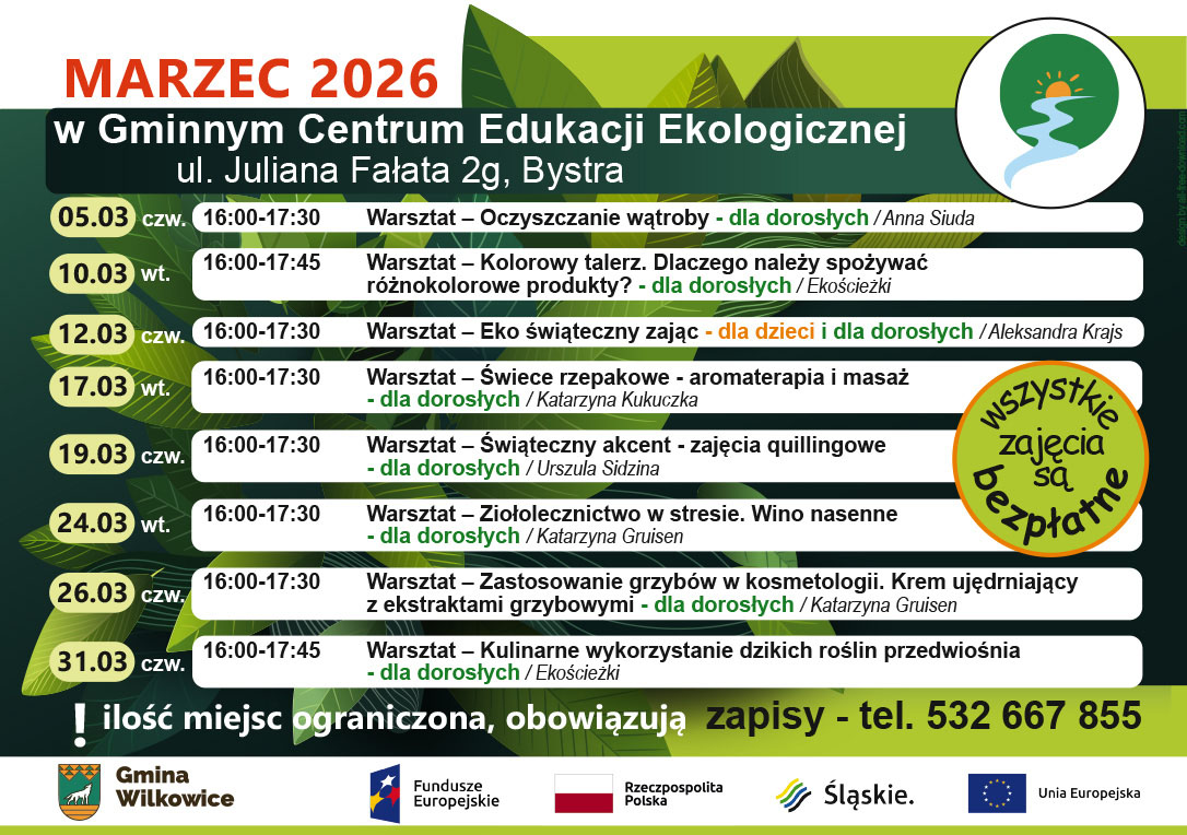 Harmonogram bezpłatnych zajęć w Gminnym Centrum Edukacji Ekologicznej w Bystrej (ul. Fałata 2G),